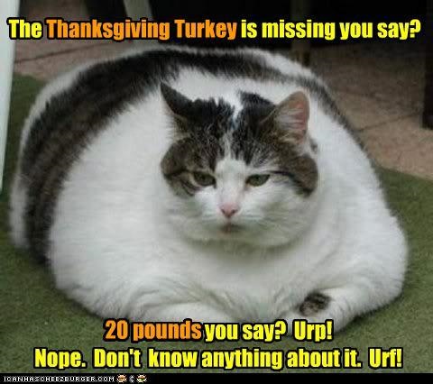 To wrap up the Thanksgiving foodfest in a suitable manner, here are a couple of today's Lolcats, courtesy of I Can Has Cheezburger? Click each picture to be taken to its Web page and read viewers' comments.